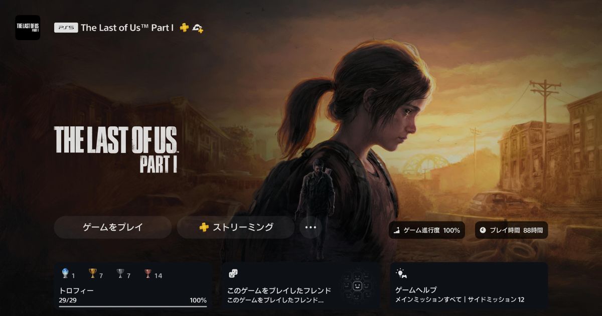 『Part I』は全トロフィーを取得(トロコン)し、最高難易度の「グラウンド」モードもクリア済みです。重厚な物語とキャラクター描写の完成度が群を抜いていました。