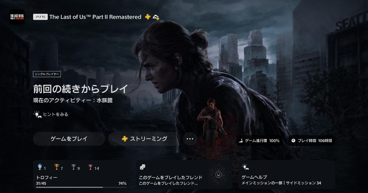 『Part I』は全トロフィーを取得(トロコン)し、最高難易度の「グラウンド」モードもクリア済みです。重厚な物語とキャラクター描写の完成度が群を抜いていました。